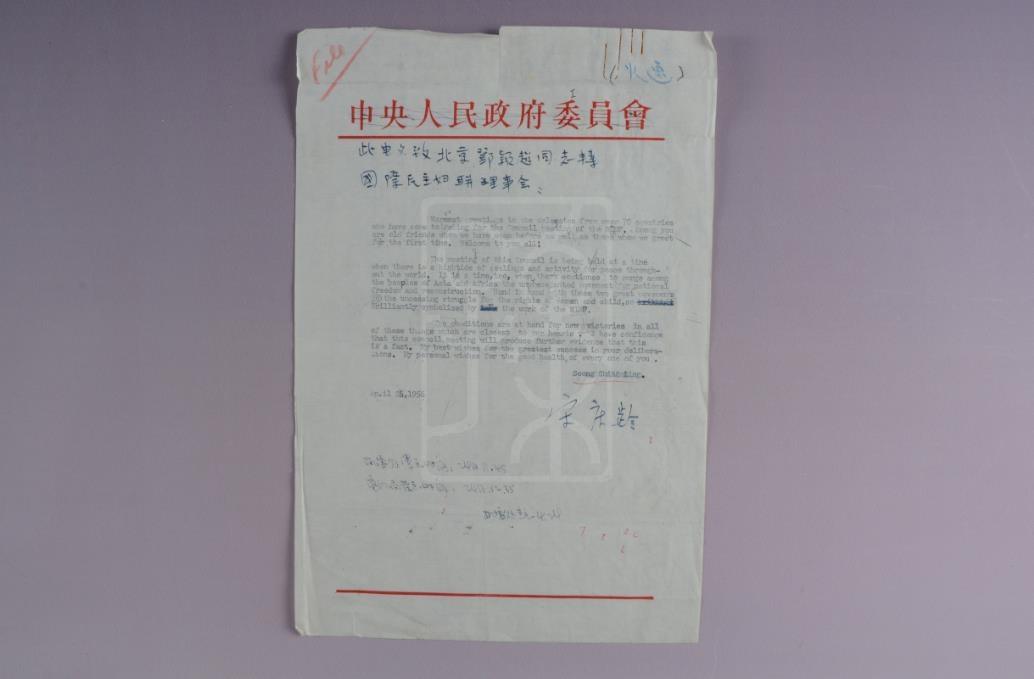 1956年4月24日宋庆龄致国际民主妇联理事会电报底稿