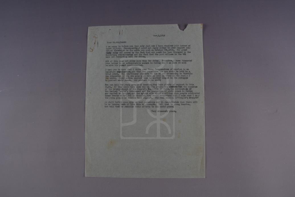 函谓:“刚刚才接到你1949年8月26日的来信,终于明白了我所收到的林菲尔德先生1949年10月5日的电报的意思。由于反动的、分崩离析的国民党的封锁,这封重要的信件被耽搁至今。但是请放心,我将立即采取措施把林菲尔德先生的请求转告有关方面。同时我也将写信把这个意思告诉他。