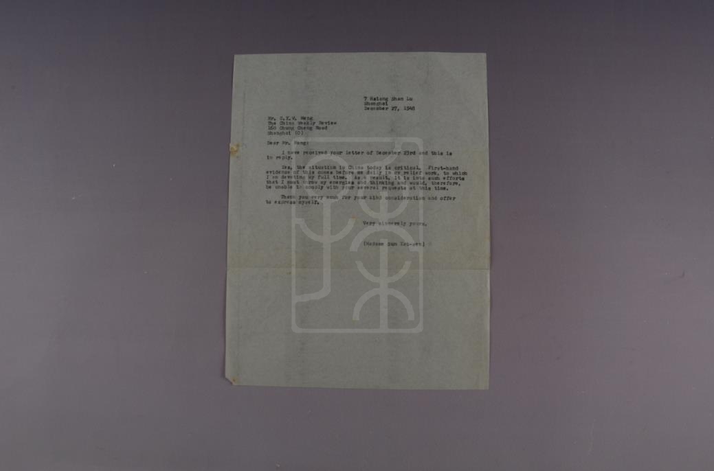 该件文物为1948年12月27日宋庆龄致孟长泳信底稿。