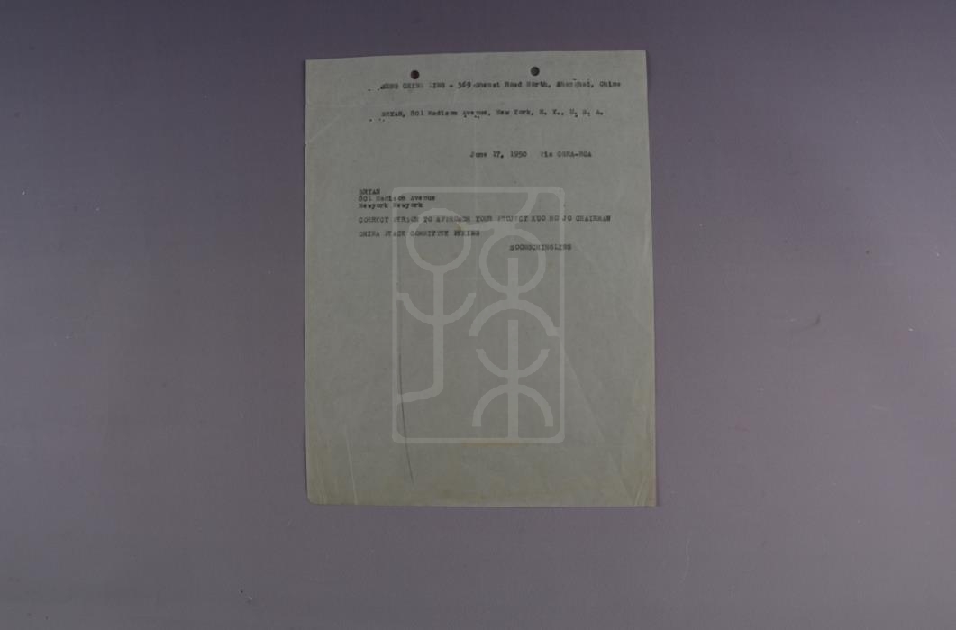 该件文物为1950年6月17日宋庆龄致海伦·R·布赖恩电报底稿。