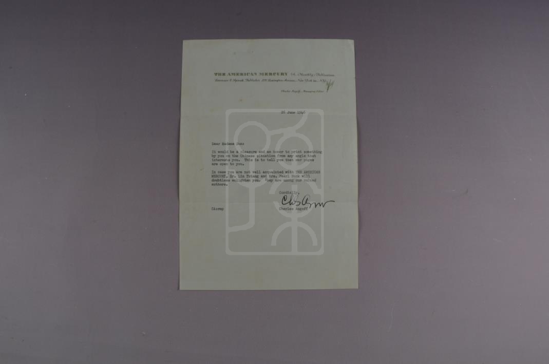 该件文物为1946年6月26日查尔斯·安格夫致宋庆龄信。
