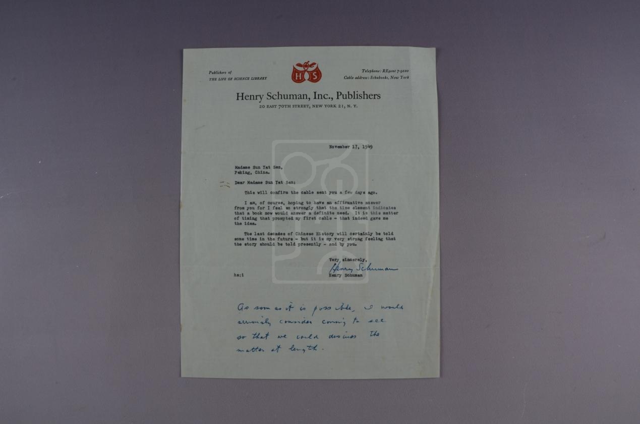 亨利·舒曼(Henry Schuman),美国出版商,亨利·舒曼图书公司的负责人。1949年11月13日致电宋庆龄,建议她出版自传。11月14日宋庆龄回复:“有此打算,但目前工作繁忙。”