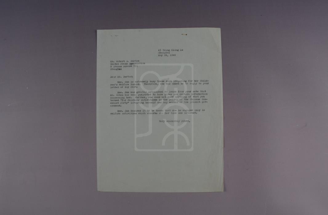 罗伯特A. 伯顿(Robert A. Burton),美联社驻上海记者,于5月21日致信宋庆龄,邀请她接受采访,澄清莫里斯·科恩对于中国共产党政策的变动、李宗仁以及她本人的一些消息。