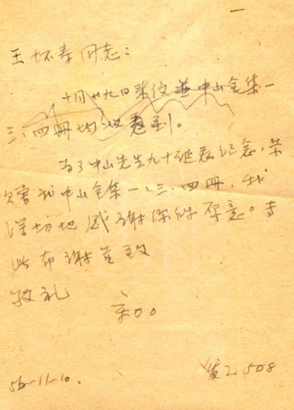 函谓:“为了中山先生九十诞辰纪念,荣赠我中山全集一、三、四册,我深切地感谢你的厚意。”