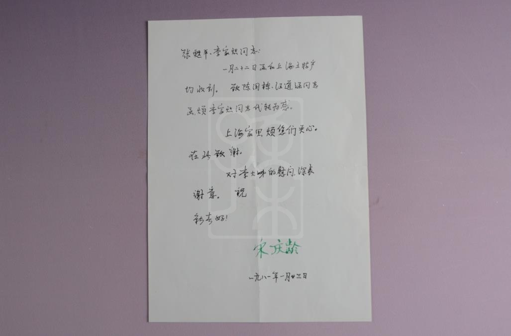 该件文物为1981年1月23日宋庆龄致张甦平、李家炽信。