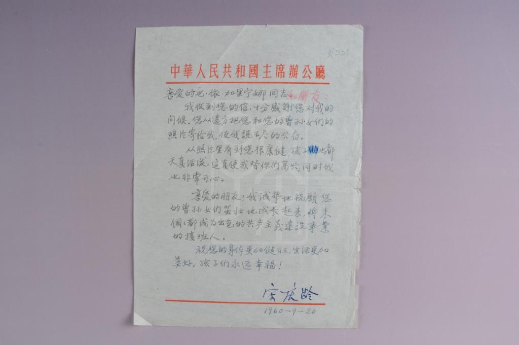 该件文物为1960年9月20日宋庆龄致依·加里宁娜信底稿。