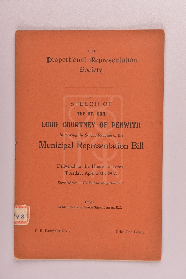 此为1907年版《比例代表制协会——尊敬的彭威斯考特尼勋爵动议二读<市政代表法案>的演说》(The Proportional Representation Society-Speech of the RT. Hon. Lord Courtney of Penwith in moving the Second Reading of the Municipal Representation Bill),属上海孙中山故居旧藏文物。