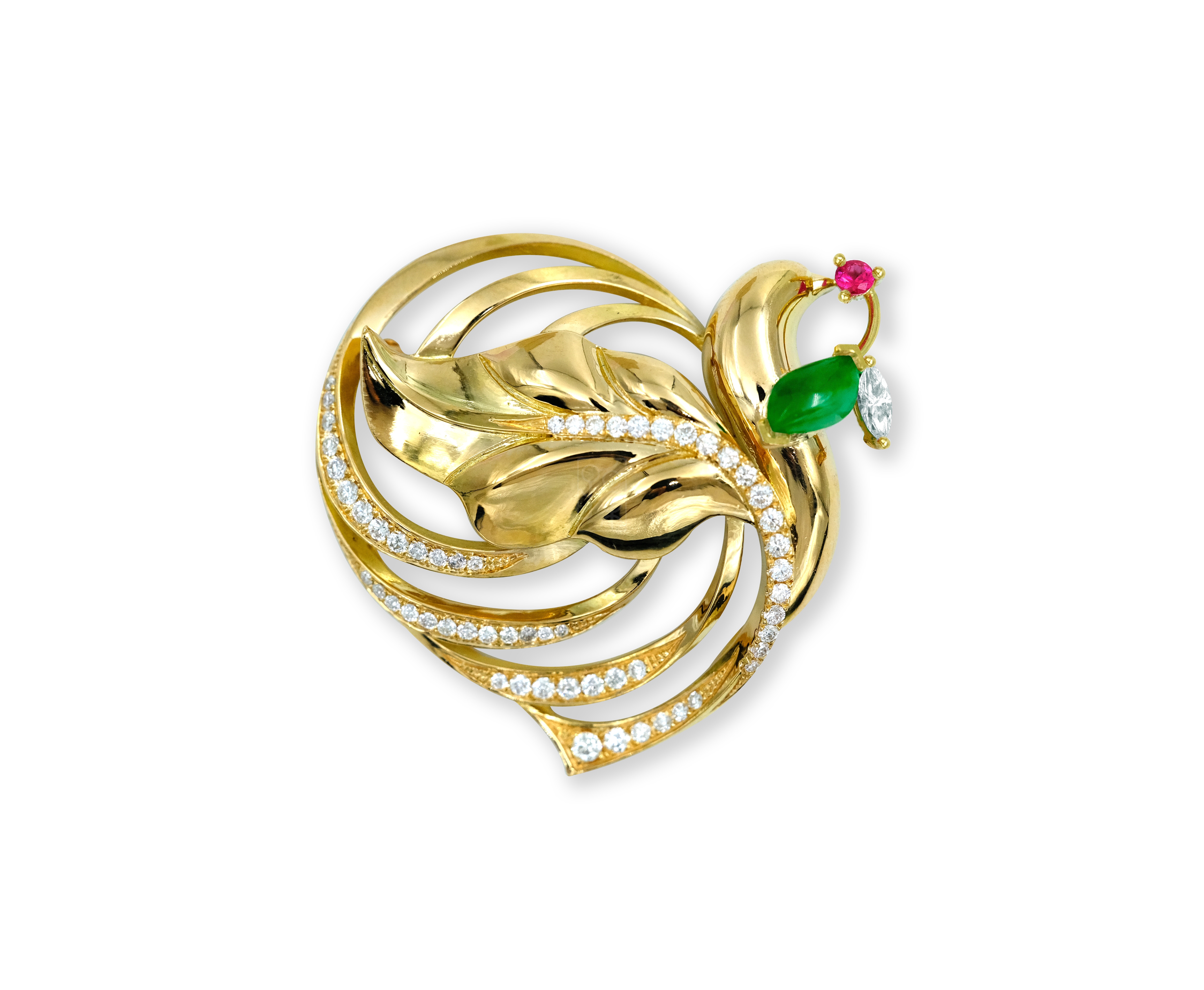 宋庆龄一生喜爱大自然的美好事物。她喜爱象征和平、友谊、团结的鸽子,她也喜爱绚烂多姿的花卉和葱茏苍翠的樟树。胸针整体以和平鸽为造型,配以清新的樟树叶和红掌花的独特设计,呈现立体效果,向人们传递信念、勇气和守护的美好寓意。