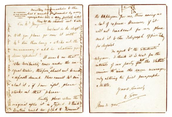 宋庆龄对帝国主义行径非常愤慨,1925年6月7日,宋庆龄在莫利爱路寓所致信杨杏佛,嘱咐他修改她起草的就五卅惨案接受记者采访等稿件。