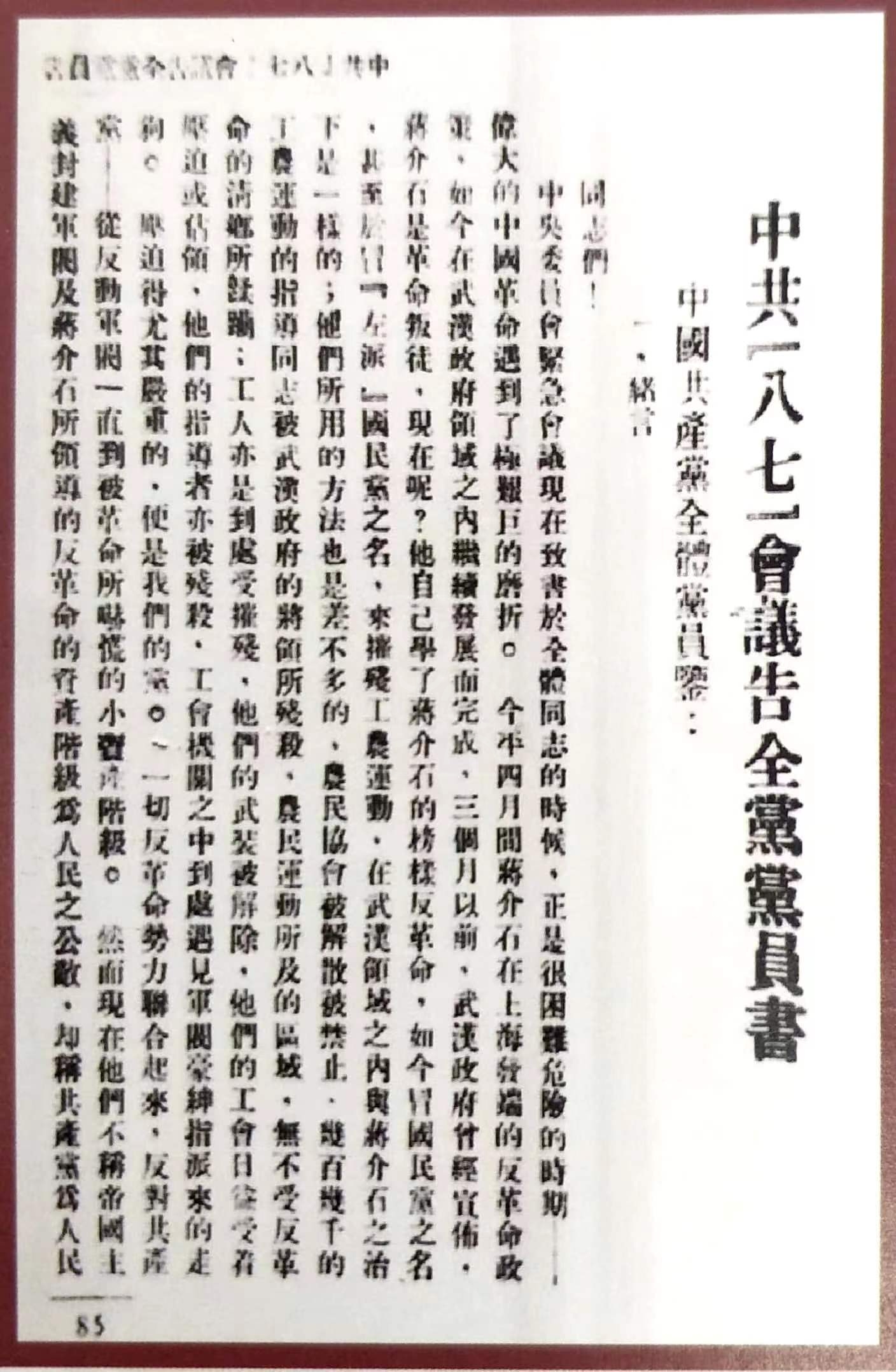 1927年8月7日,中共中央在汉口秘密召开紧急会议,即“八七会议”,确定实行土地革命和武装反抗国民党反动派的总方针。