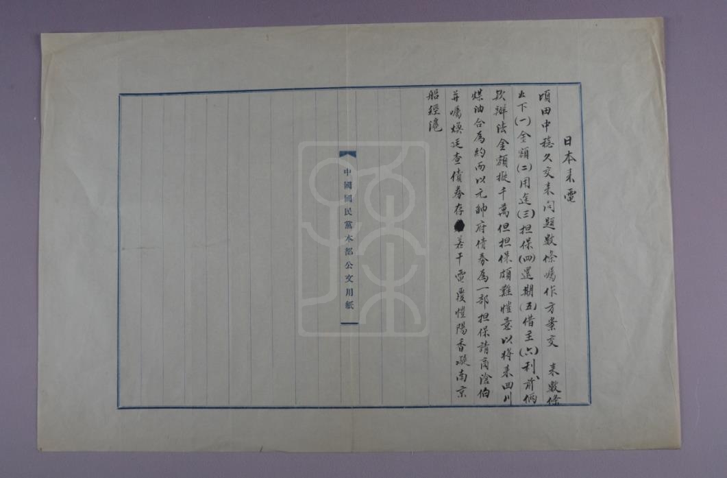 电文谓:“顷田中稔久交来问题数条,嘱作方案。交来数条如下:(一) 金额,(二) 用途,(三) 担保,(四) 还期,(五) 借主,(六) 利。前俩款办法,金额拟千万,但担保颇难。恺意以将来四川煤油合为约,而以元帅府债券为一部担保。请商沧伯,并嘱焕廷,查债券存若干,电覆。恺。阳。香凝南京船经沪。”