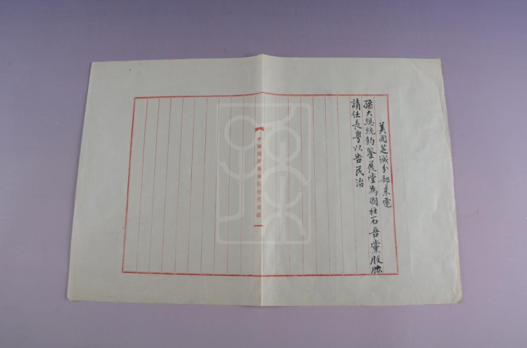 该件文物为宋庆龄保存的1923年1月中旬芝加哥国民党支部致孙中山电。