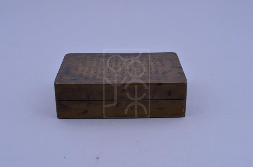 该件文物为宋庆龄保存的铜墨盒,盒盖阴刻唐代司空图的《诗品二十四则·雄浑》《诗品二十四则·典雅》《诗品二十四则·洗练》。
