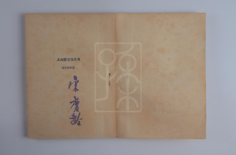 该件文物为宋庆龄保存的《飞兵在沂蒙山上》,韩希梁等著,为中国人民文艺丛书社编辑的“中国人民文艺丛书”之一,新华书店1949年出版。扉页印有宋庆龄印章。