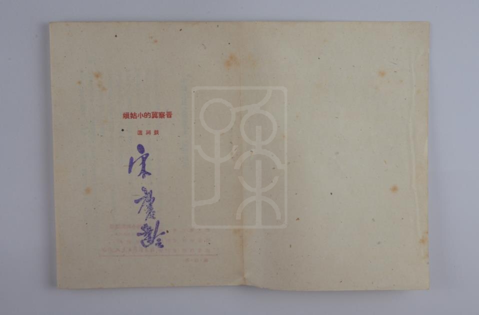 该件文物为宋庆龄保存的《晋察冀的小姑娘》,王尊三等著,为中国人民文艺丛书社编辑的“中国人民文艺丛书”之一,新华书店1949年出版。扉页印有宋庆龄印章。