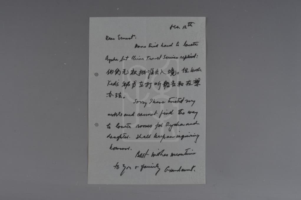函谓:“我已经很努力想办法安顿阿霞,可是中国旅行社回答:他们无权批准入境。但承志舅舅的秘书在打听船名和在想办法。