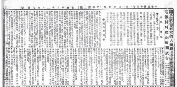《申报》1925年1月1日刊登的孙中山到京及《入京宣言》的相关报道